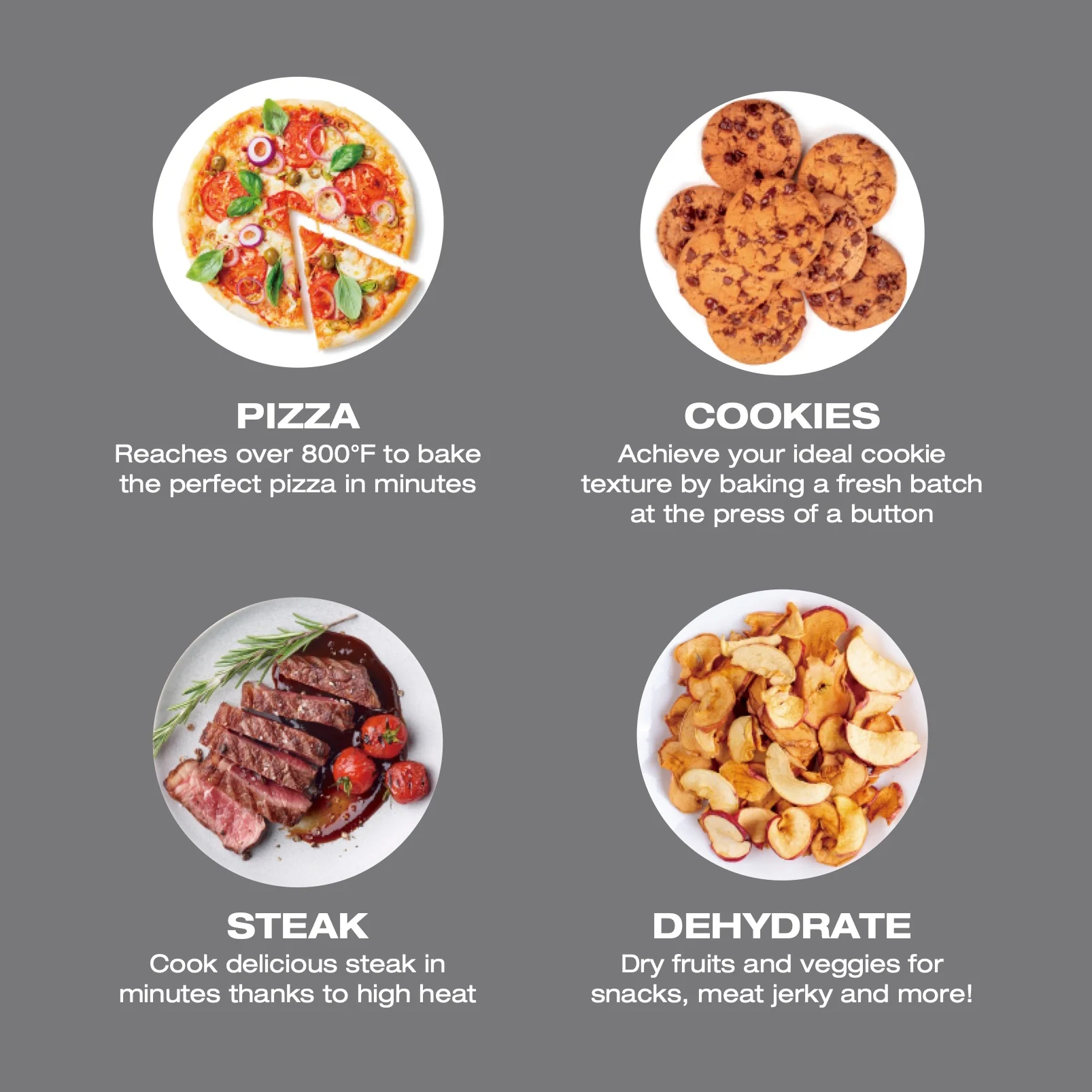 - 15 pre-programmed cooking functions: air fry, roast, broil, toast, bagel, bake, warm, defrost, ferment, dehydrate, frozen pizza, veggies, fries, wings, and cake