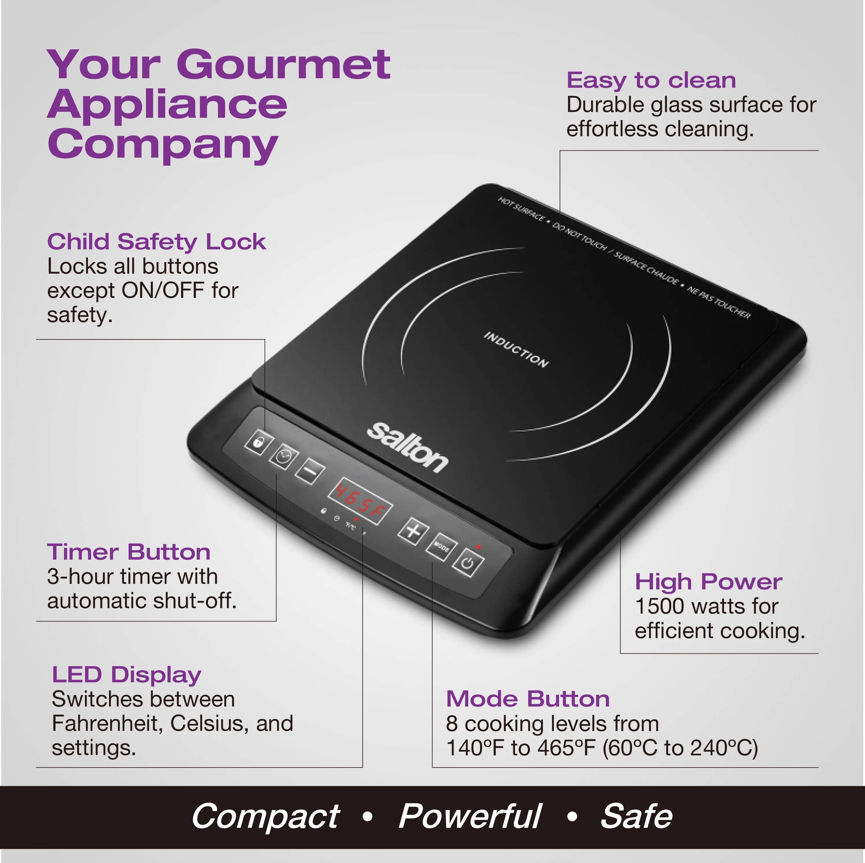 ⢠8 cooking levels 60°C to 240°C (140°F to 465°F)