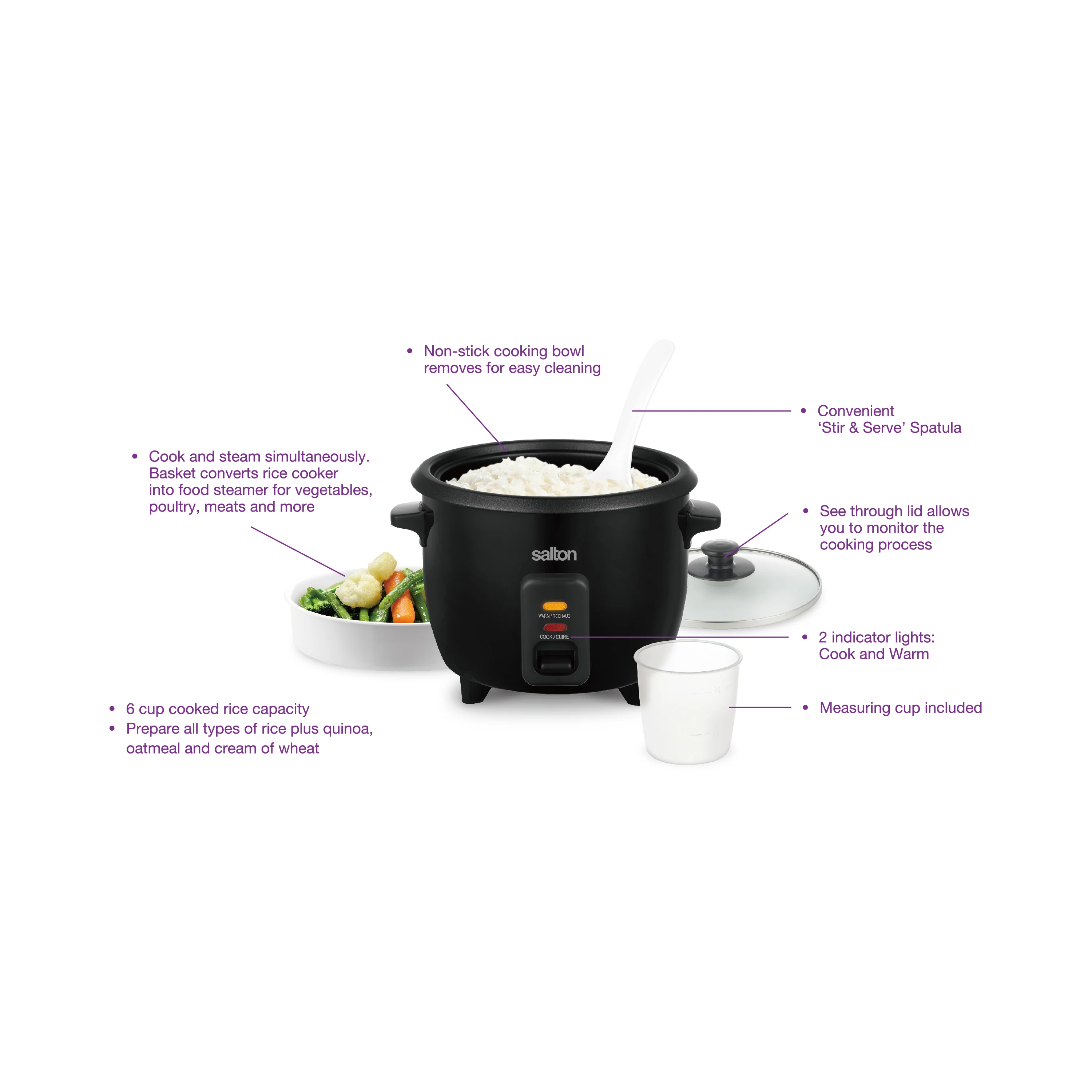 Salton’s 6 Cup Rice Cooker can cook up to 6 cups of perfect rice and keep it warm until you are ready to serve. The non-stick bowl removes for easy cleaning! Comes with a convenient ‘stir and serve’ spatula, and a glass lid to monitor the cooking process. Make the perfect amount of fluffy rice every time!