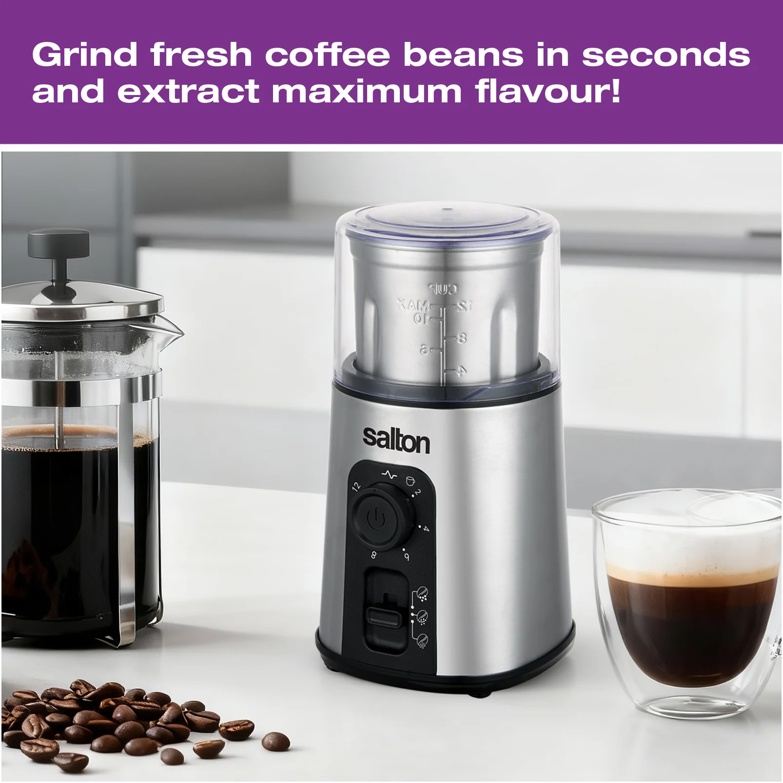 Grind your favourite coffee, herbs or spices to the perfect coarseness in 4 easy steps with the Salton Intelligent Coffee Grinder! Simply fill the bowl, select the number of cups, choose your coarseness and press start. The precision timer takes over to ensure your ingredients are ground uniformly without burning. Want a custom grind? Use the pulse function to manually control the stainless steel blades. With a capacity of 12 cups and 6 different grind settings, this grinder is a force to be reckoned with!