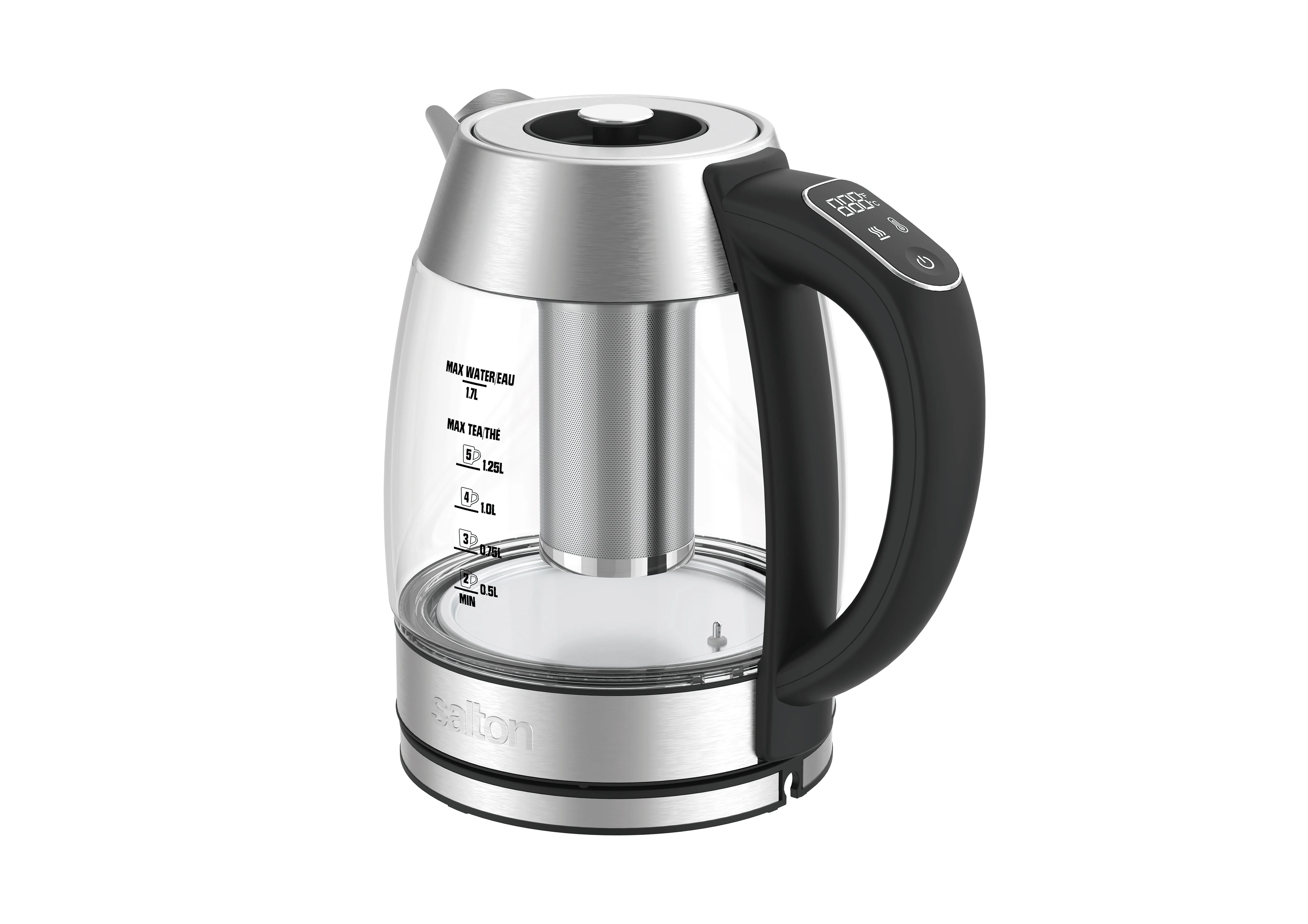 Different teas taste best at different temperatures. The Salton Temperature Control Kettle lets you choose the perfect temperature for your tea. Using the touch control, you can cycle through 7 temperatures on the bright digital display and choose your desired temperature. From oolong to chai to herbals and black - the perfect cup of tea is yours at the press of a button! The unit's keep warm function keeps water at the ideal drinking temperature for two hours with automatic shut off for worry-free use. Tuck the cord under the 360° base for a clutter-free countertop. Removable Tea Steeper for loose or bagged Tea. With LED lights that change as the temperature rises this stainless steel and glass kettle is the ultimate addition to any kitchen.